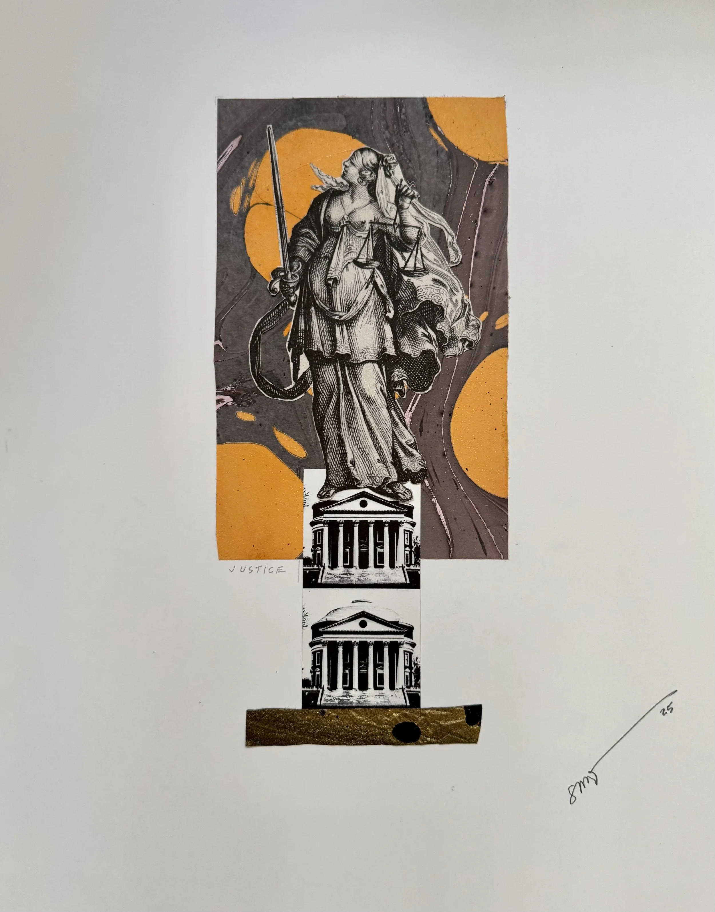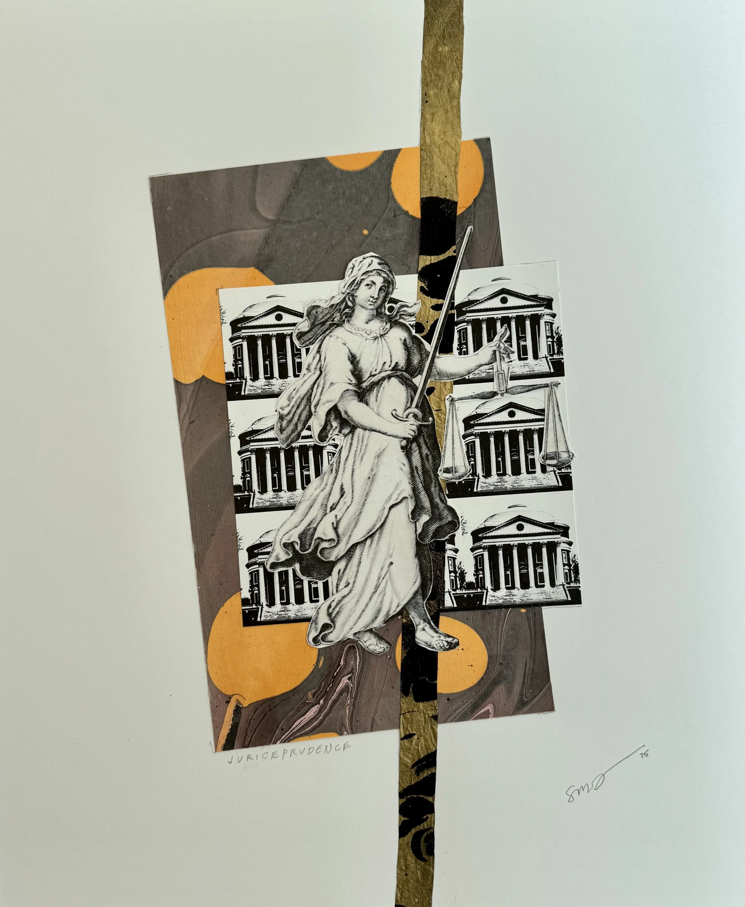 Justice engraving by Abraham Bosse (-1676). Baroque Period. Manipulated photo prints and handmade marbleized paper on Bristol Board. 14”x 17” (2025)
