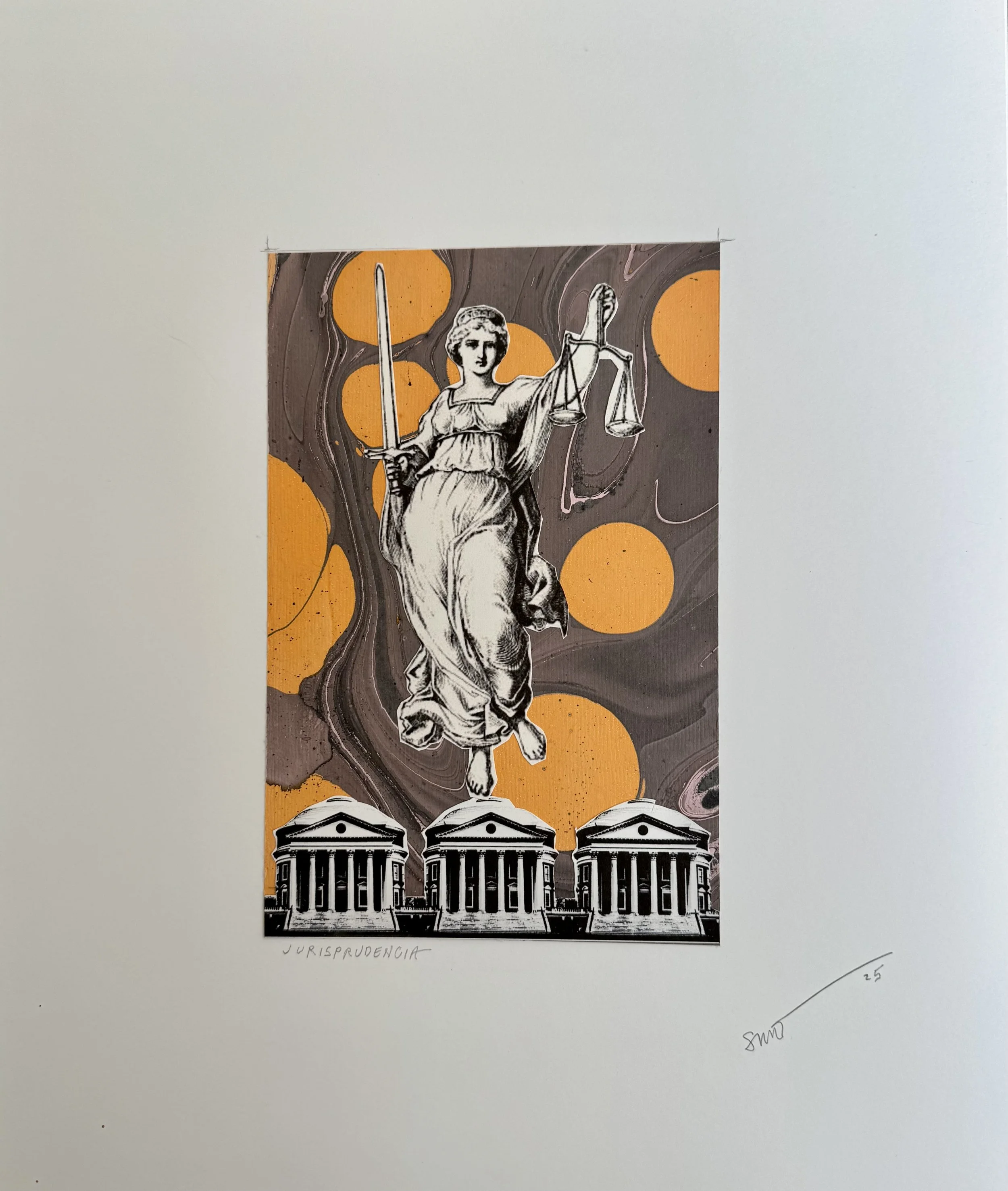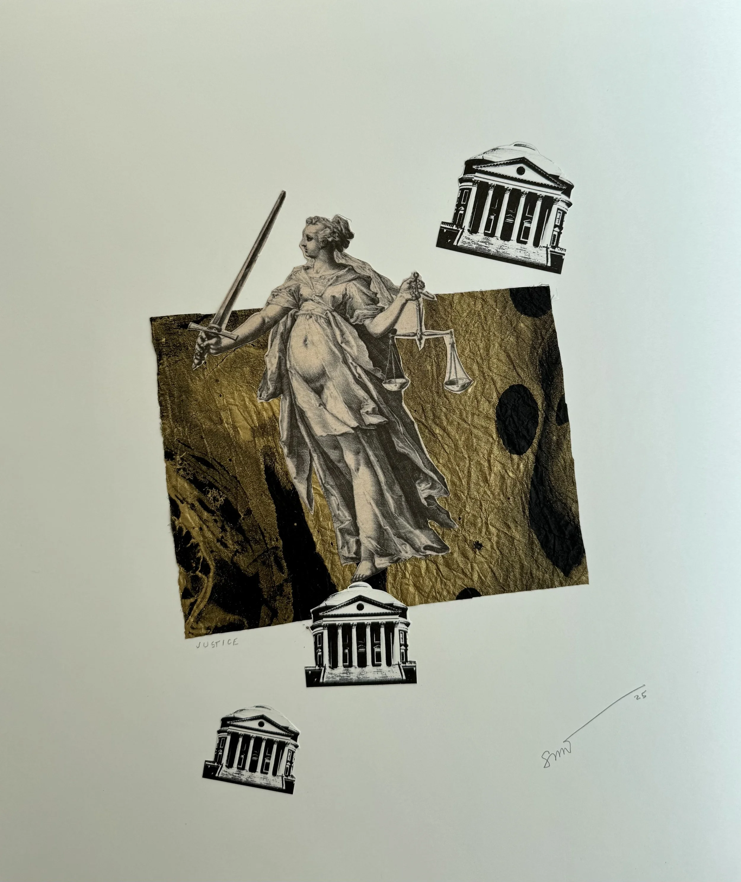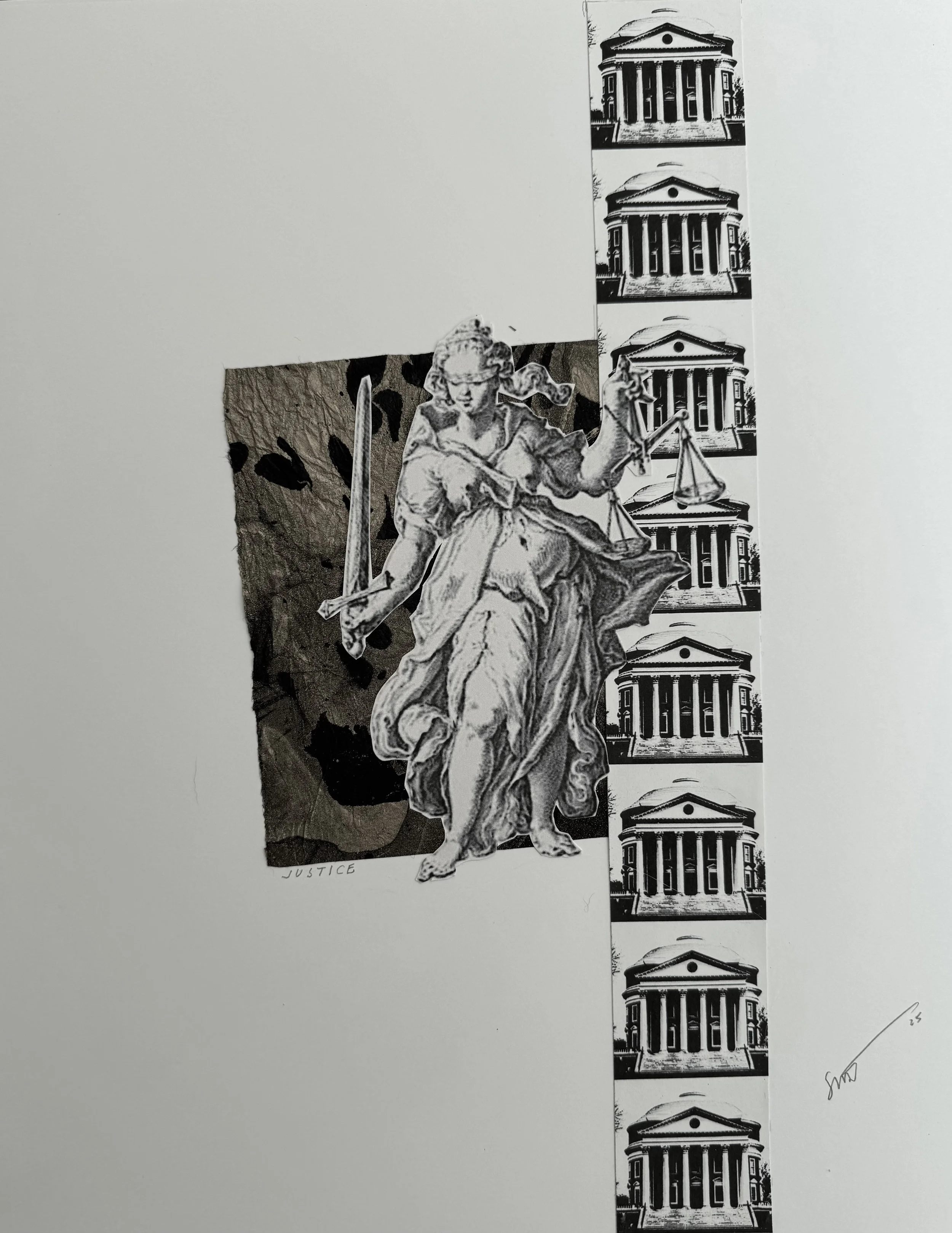Justicia is a series of collages depicting the Roman Goddess of Justice. In modern times she is referred to as Lady Justice. Each image depicts the goddess with her symbols—the sword representing authority, scales representing the weighing of evidence, and sometimes a blindfold representing impartiality. She is meant to administer judgment without prejudice or bias, based only on facts and law.