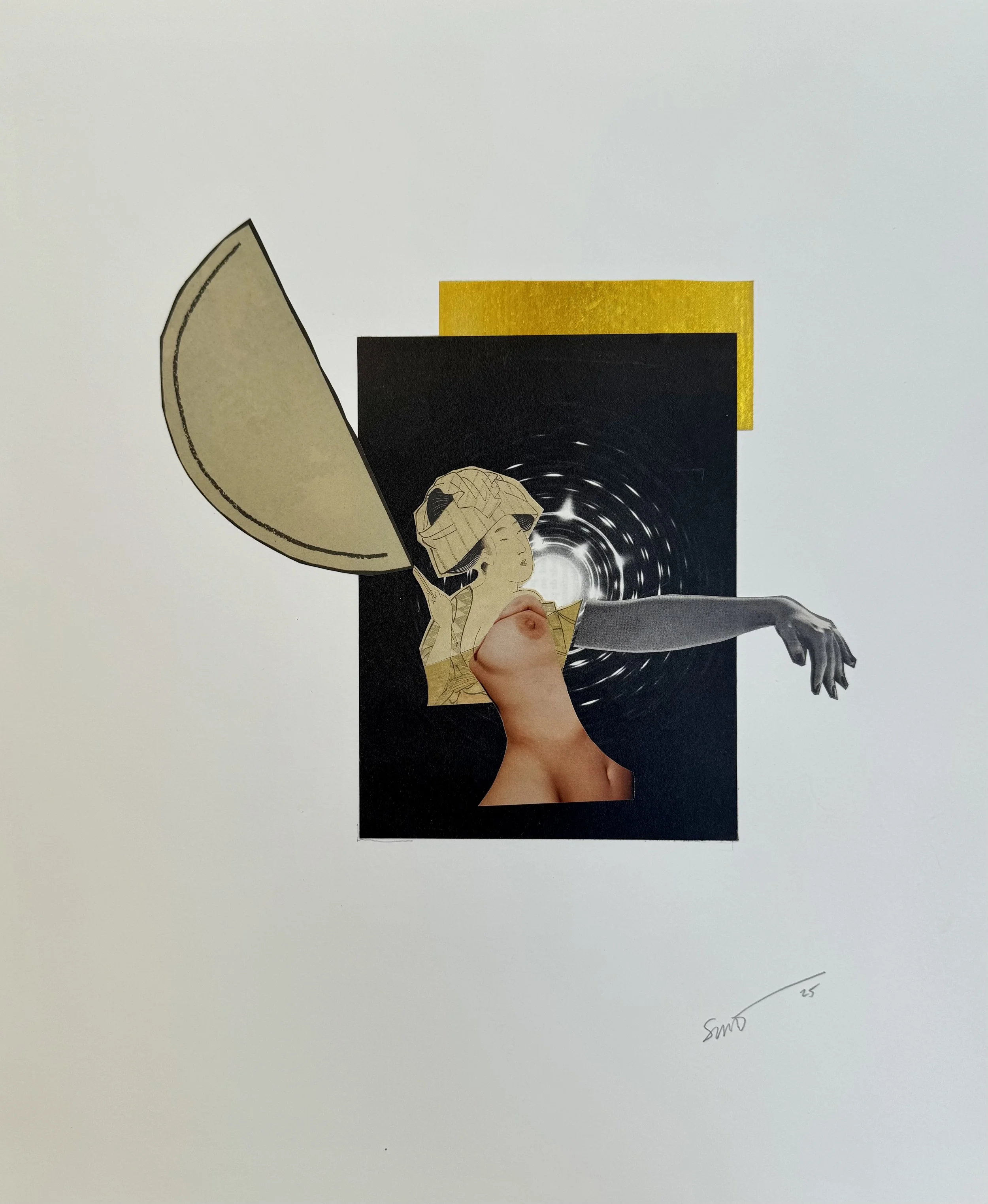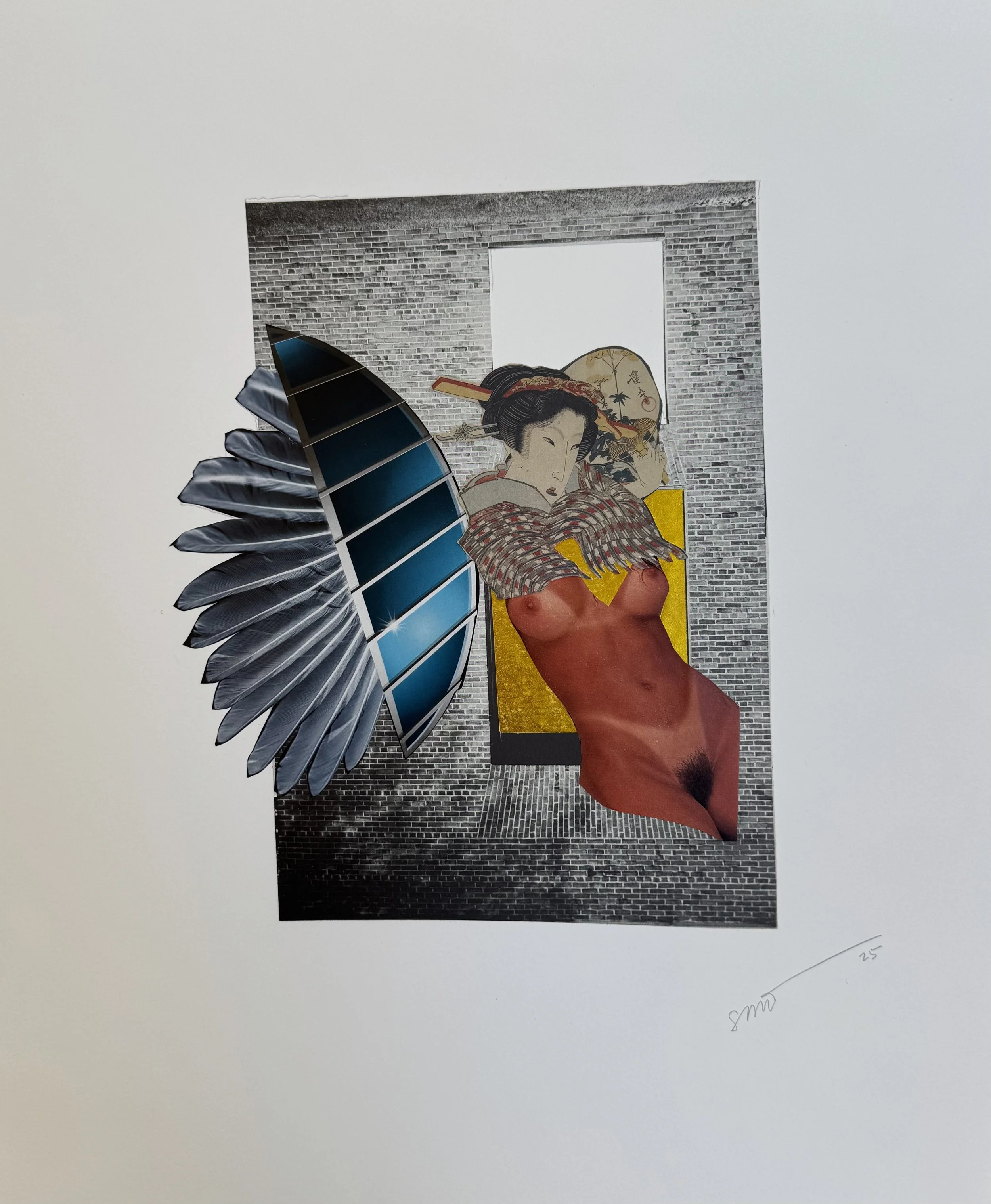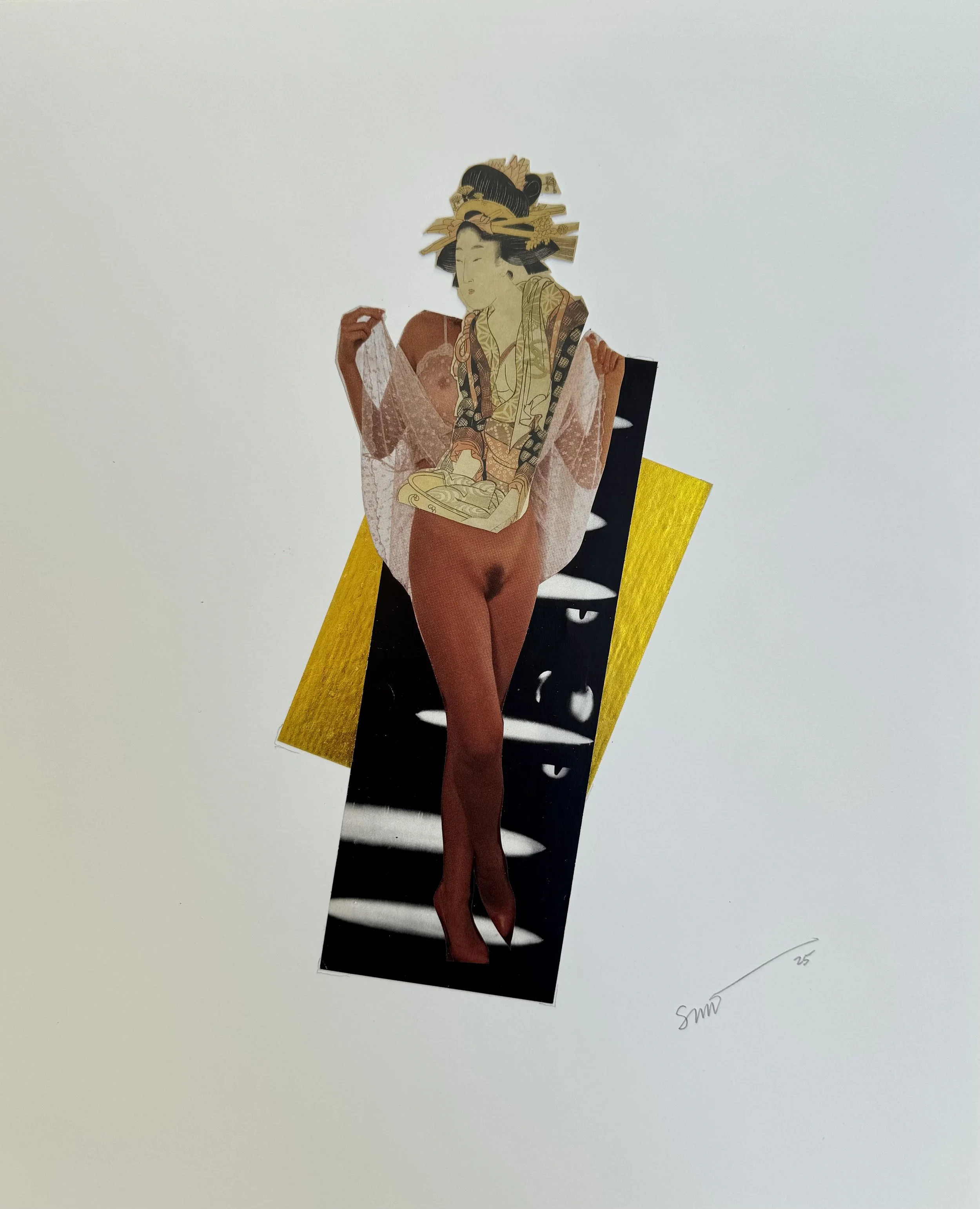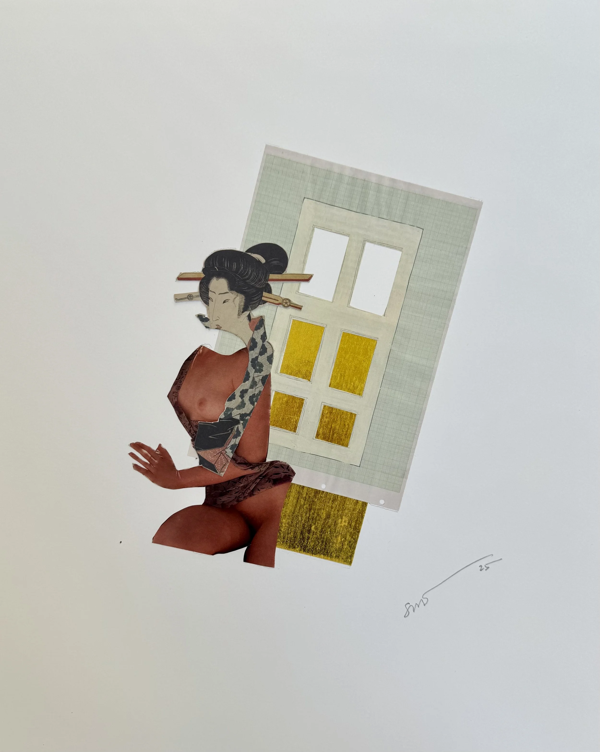 Magazine cuttings, Japanese postcard fragment and gold Chinese Joss paper on Bristol Board. One of a series of four 14”x 17” (2025)